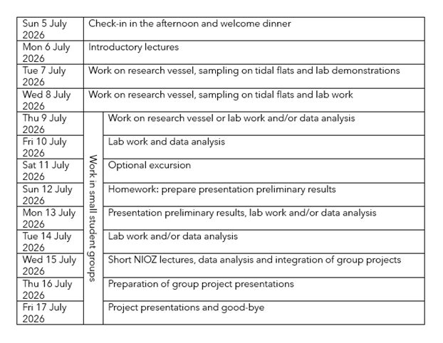 The course includes a pre-course reading assignment, classroom lectures, field- and lab work, data analysis and an oral presentation. On the first day, a series of introductory lectures on physical oceanography, marine chemistry, marine geology and marine ecology will be given. In the three days thereafter, various equipment and methods of sampling and data collection in the field and in the NIOZ labs will be demonstrated, and students will collect data in small groups in the western Wadden Sea on the research vessel Wim Wolff and/or on the tidal flats. In the remaining time of the course, students devote themselves to individual research projects, which are supervised by NIOZ researchers. Depending on the project, the work will include laboratory work and/or modelling, and all projects will involve data analysis, interpretation of acquired data and the preparation of a presentation given on the last day of the course. As students spend quite a bit of time analysing the collected data, knowledge of a programming language (e.g. R, Python, MatLab) is useful to have, but this is not a prerequiste. Furthermore, early career researchers will present current research activities at NIOZ in the second week. The students' assessment will be based on demonstrated performance during practical work, data analysis and the oral presentation of the results.