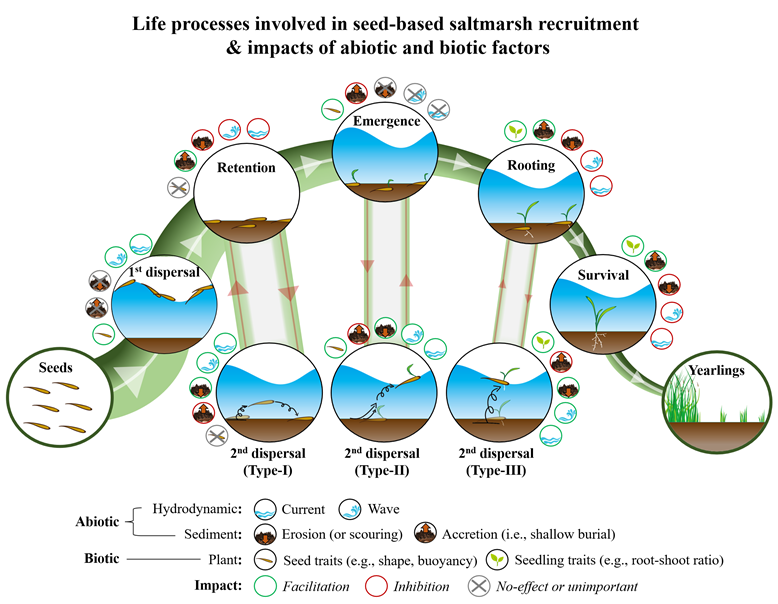 The results provide guidelines and valuable first-hand data for future model efforts to simulate salt marsh evolution and identify demographic stages that drive recruitment failures. More importantly, this mechanistic process study can be translated into practical guidelines for effective conservation and restoration of salt marshes through seed-based or seedling-based approaches, thereby contributing to incorporating salt marshes in nature-based applications such as coastal defense, climate stability, or carbon sequestration.